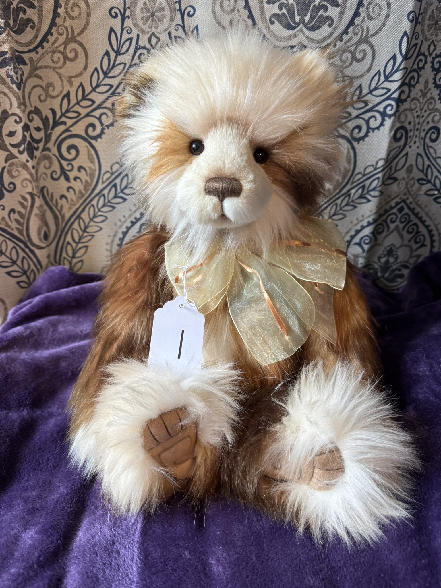 Annie Versary is a fully jointed bear. Look for her party pals Carnival and Shindig. She has a mix of creams and browns and white plush with an organza bow around her neck.