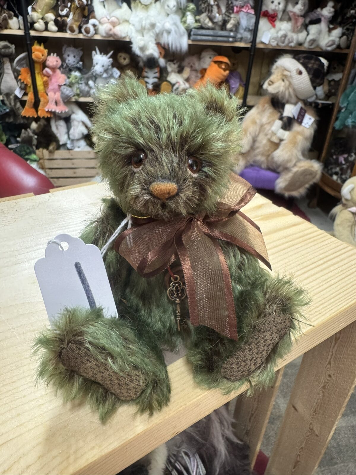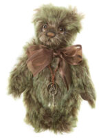 Bean Sprout is a fully jointed tiny bear and part of “Tiny Teds” series. Look for his tiny pals Clothes Peg and Tadpole. He has amazing attention to detail with his dark brown mohair with forest green tipping.  He has a beautiful organza brown bow around his neck along with a key pendant.  He comes in an embroidered drawstring bag.  Hand wash cool, with care. Suitable for ages 14+