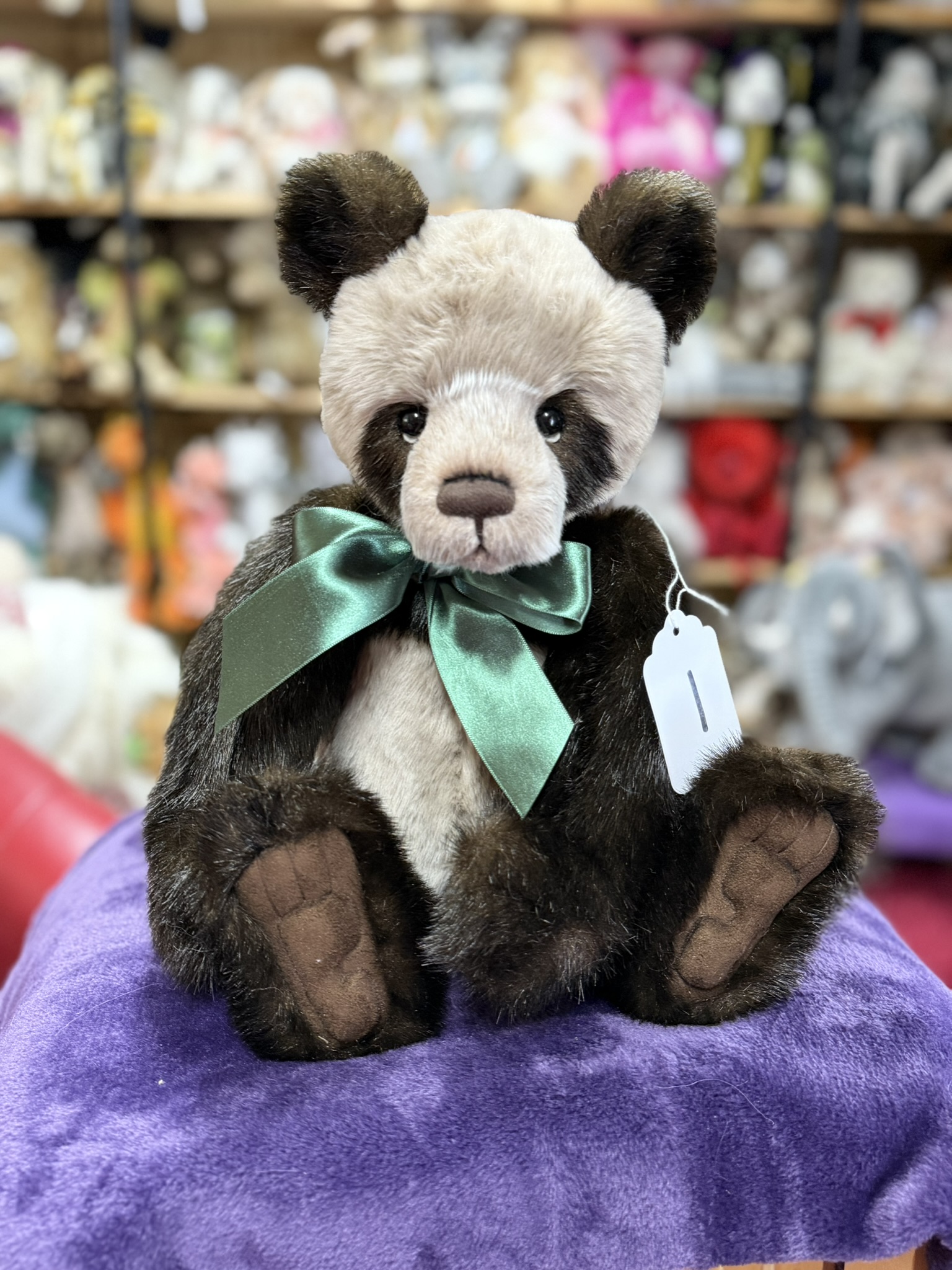 Botwood is a fully jointed panda bear. He has soft black and beige fur and a satin green bow around his neck. He is part of a trio. Look for Burton and Barlow. Suitable for ages 3 and up.