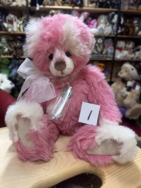 Charlie Mohair Year Bear 2021 is fully jointed, she is a sweetie with her large off white lace head and neck bows. She comes in a blue embroidered canvas bag. Surface wash with care. Suitable for ages 14+