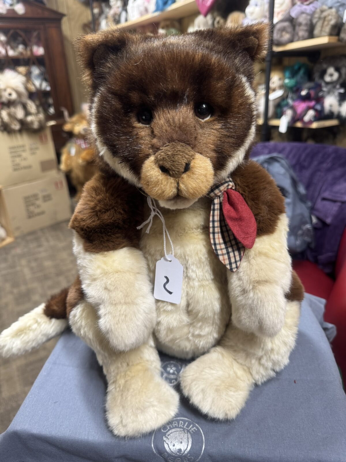 Chester is a non-jointed tree kangaroo plush. He is named after a world famous Chester zoo and is an endangered species with only 50 remaining in the wild. He has beautiful soft dense sandy beige belly, arms and legs and soft short brown rich plush. He has a plaid neckerchief and is machine washable. Suitable for ages 18 mth and up.