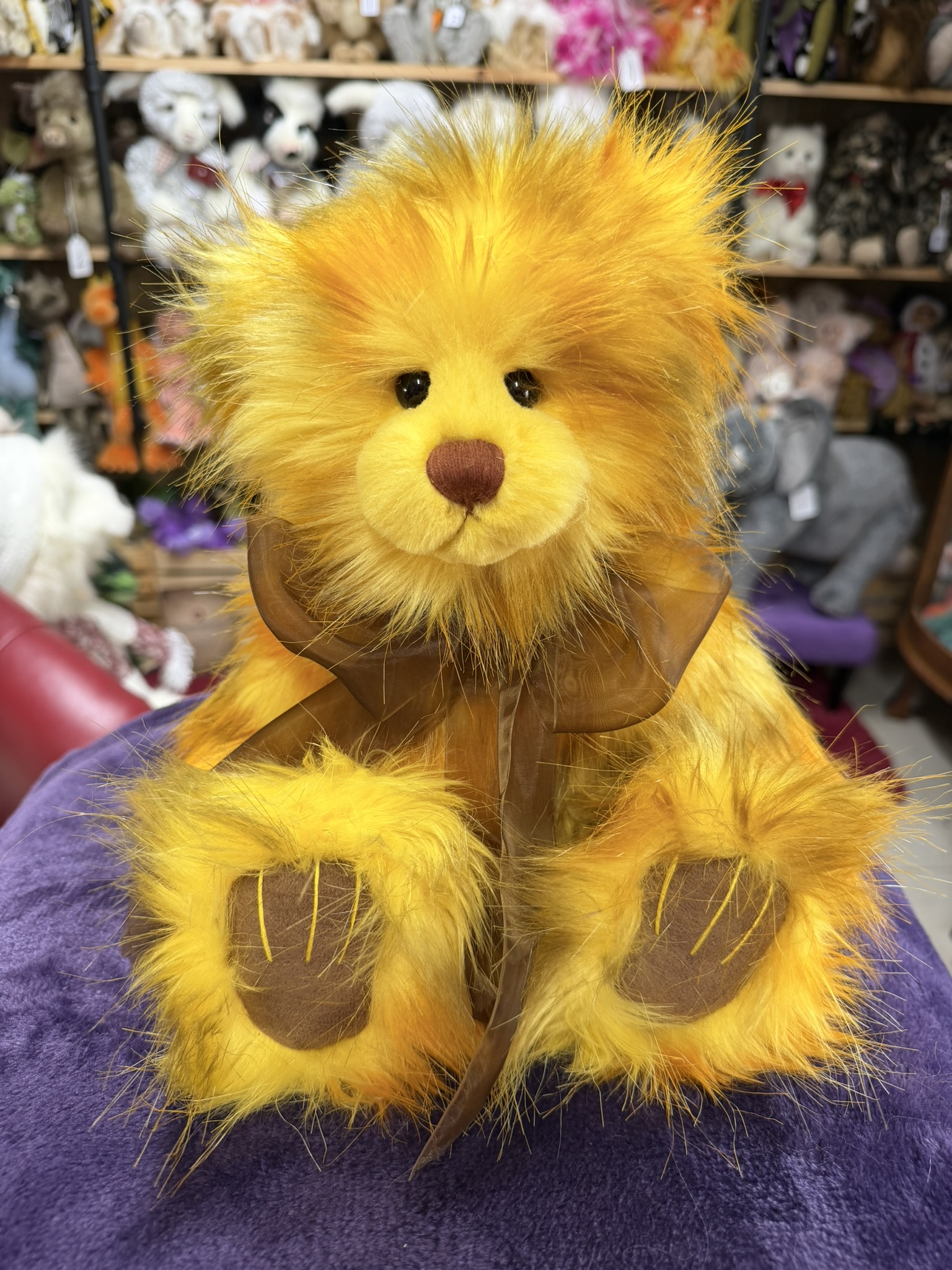 Cuddlesworth is a fully jointed bear. She has vibrant yellows, burnt oranges and brown plush with mataching brown organza bow and paws. Suitable for ages 3 and up.