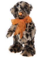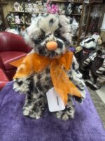 Currant Bun is a fully jointed standing bear. Look for her friend Choccy Biccy. She has leopard print plush with an orange hand stitched nose that matches the organza bow around her neck.