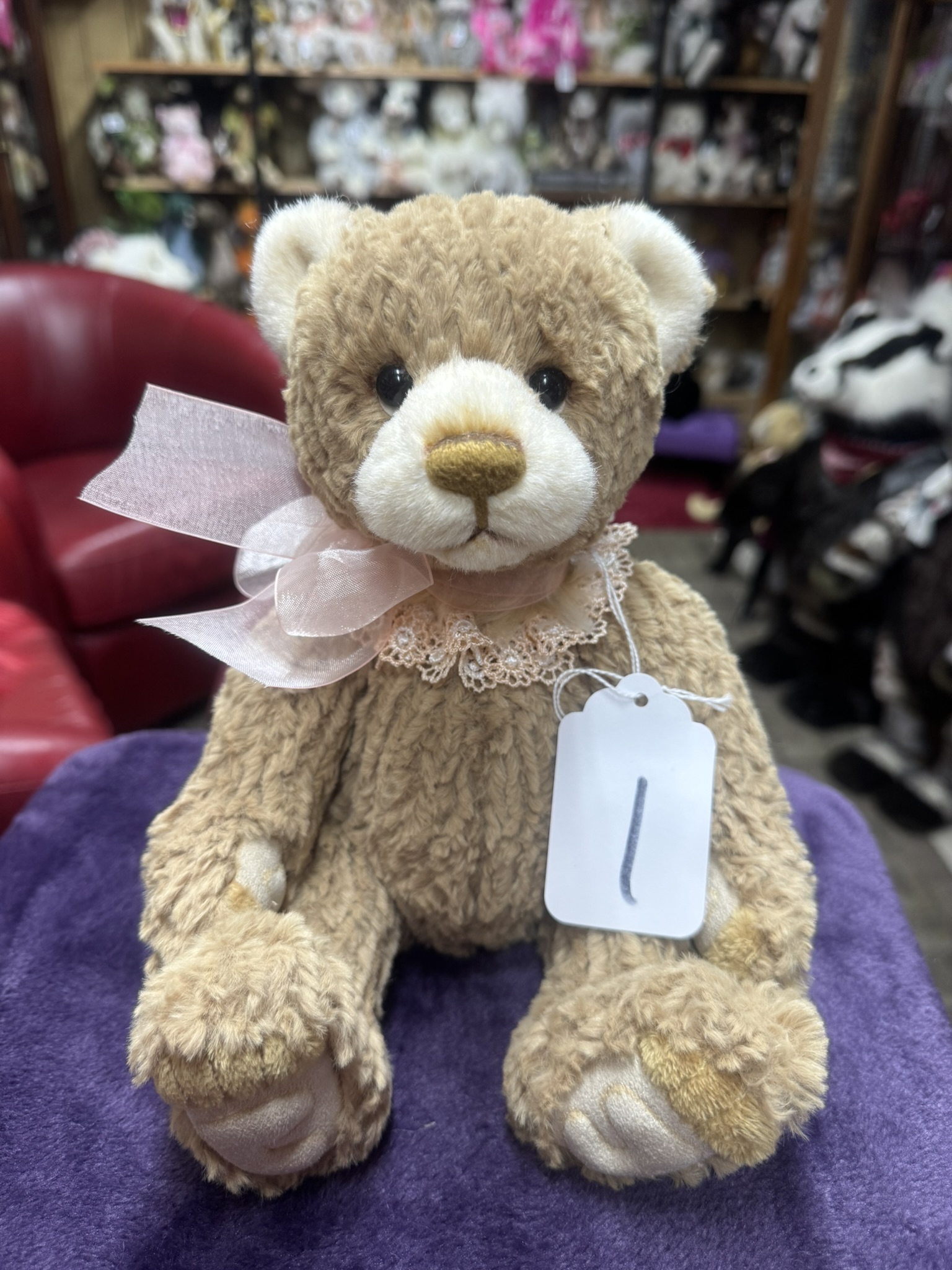Cwtch is a fully jointed baby soft plush bear. He is part of the most cuddly paw-fect pair and make bear-illiant cuddle buddies. Cwtch is Welsh for cuddle which is what he loves to do best! He has super soft textured light brown plush with cream muzzle and ears. He has sculpted paws with fur for his toes, lace collar, peach organza bow and a hand stitched nose. Look for my snuggle buddie Coorie. Surface washable, suitable for 3 years +