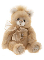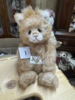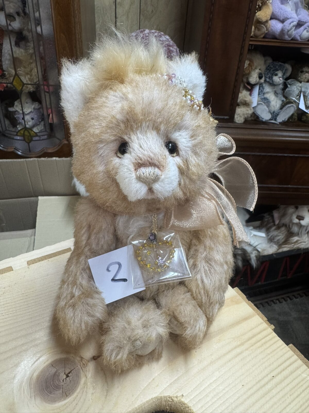 Darcey is a fully jointed bear. She is part of the leaving their paw-prints on the world collection. She is one of our three Ballet Dancers. Look for Anna and Isadora. She is made from Alpaca and Mohair she is light brown and white fur with a gold organza bow a beaded wire heart shaped necklace and beaded head piece. She has a silver hand stitched nose that shimmers with a tufted of hair on her head. Not suitable for under 14 years of age and surface wash with care only.