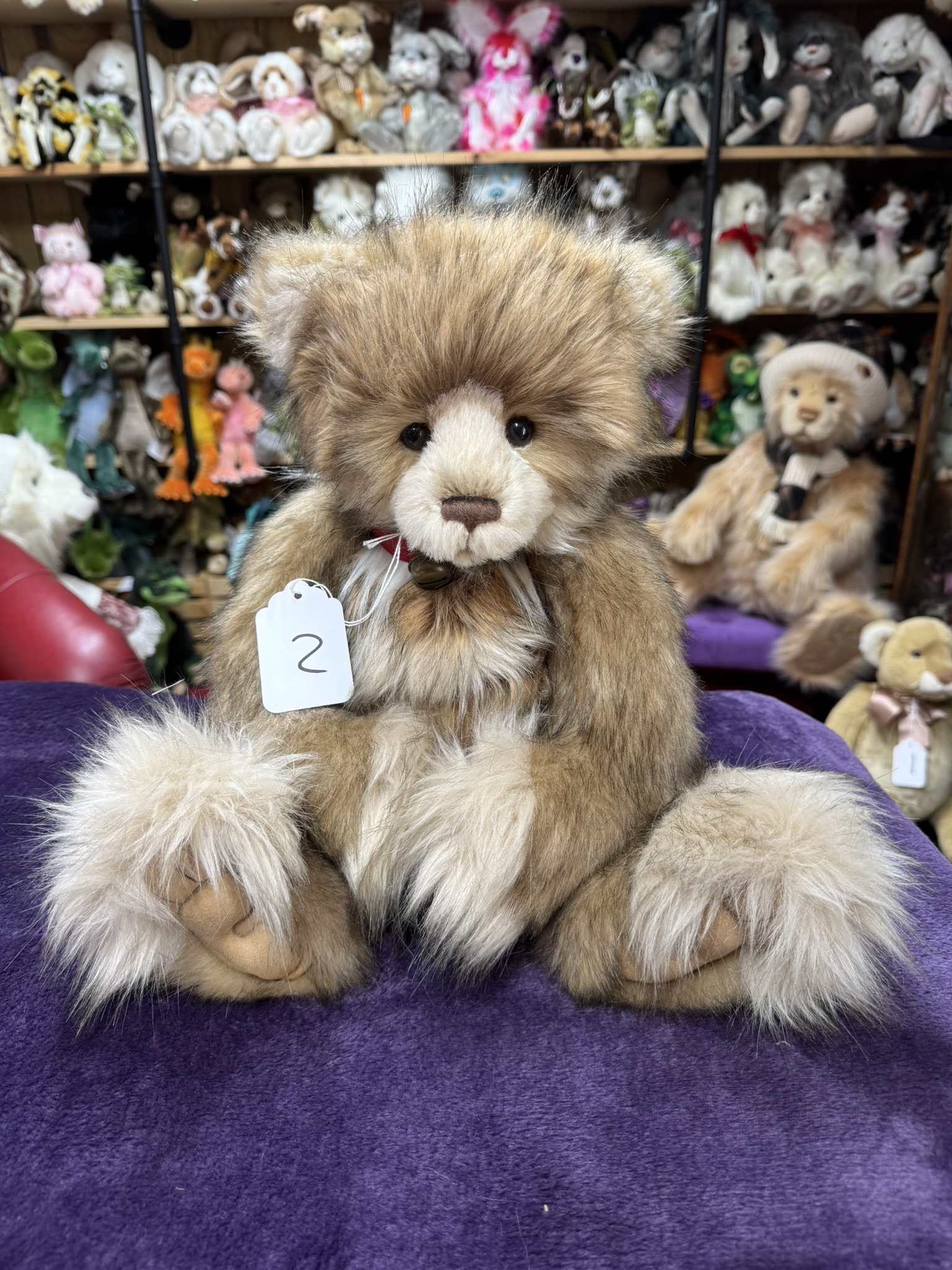 Donalda is part of a pair and is fully jointed. She is a combination of plush and alpaca with black strands throughout her gorgeous sandy brown plush giving her a full and fluffy look. She has fluffy long cream sculpted tan paws and a brass bell collar. Hand was in cold with care. Suitable for ages 3+