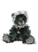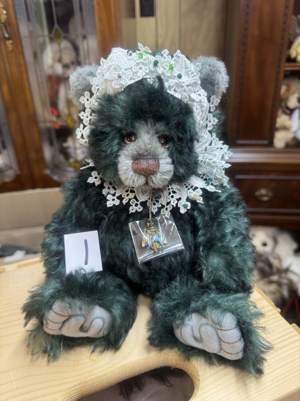 Doreen is a fully jointed bear. She has a mixture of dark and light emerald green mohair fur all over. She wears a delicate lace head piece and collar with a beaded pendant. She is part of a pair, look for Delilah. She comes with a blue embroidered canvas bag. Suitable for 14 years and up, surface wash wish care only.