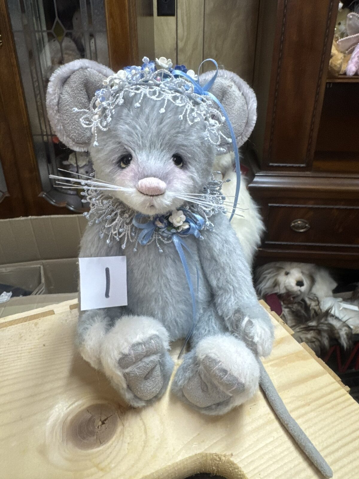 Folk Tale is a fully jointed mouse. This cute little lady is pale grey/blue with a lace collar and head piece. Look for her friend Fairy Story.