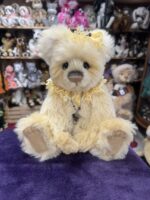 Isabelle Materpiece 2025 is a fully jointed panda bear. She has banana cream fur with a lace head piece, lace collar and charm around her neck. She comes with an embroidered bag. Not suitable for under 14 years of age and surface wash with care only.