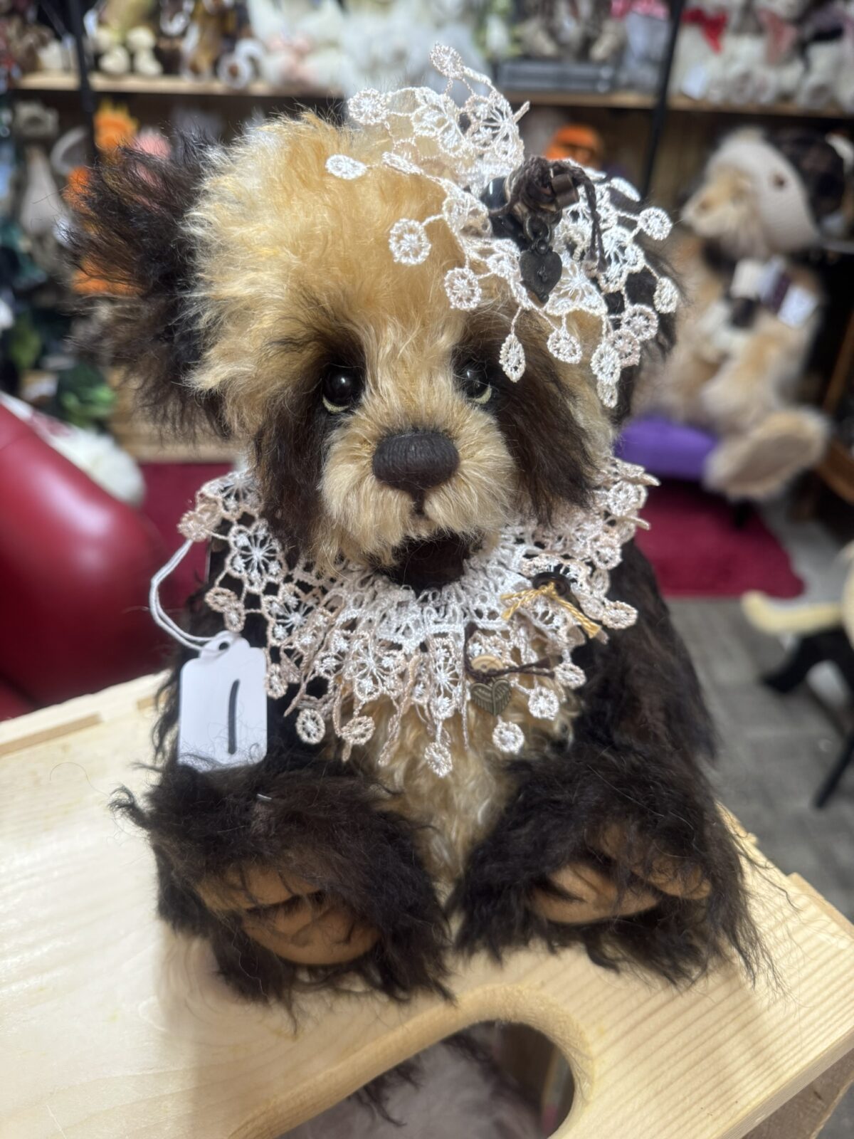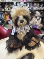 Jubilee is a fully joined panda bear. She has long dark chocolate brown and cream crinkled fur. She has a lovely lace head piece and matching collar. Look for her party partner Gala.