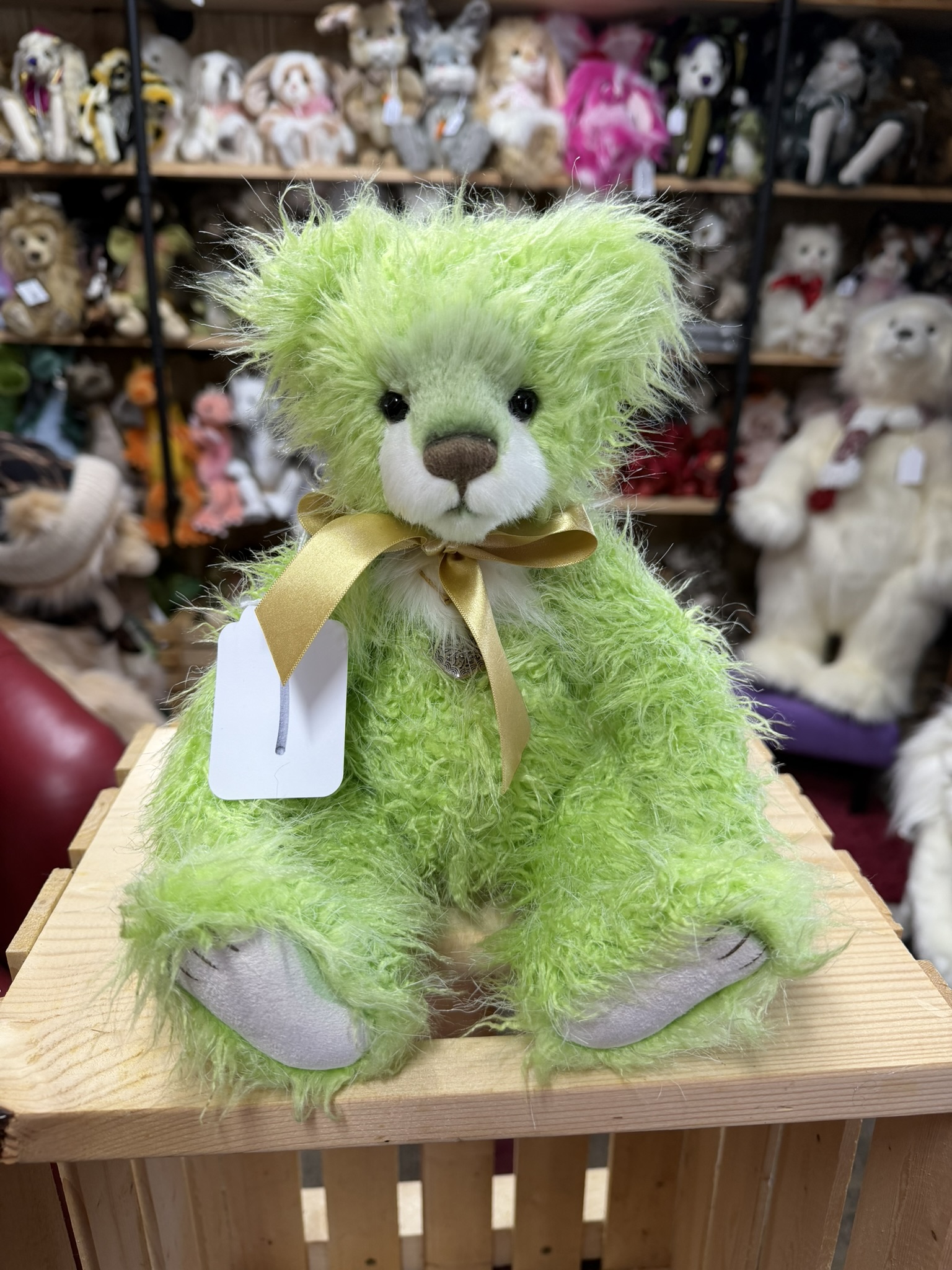 Keylime Pie is a fully jointed bear.  She has long lime fur with a satin bow around her neck.  She is part of a sweet trio.  Look for her friends Blueberry Pie and Banoffee Pie.  Suitable for ages 3 and up.