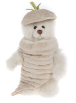 Lancer is a fully jointed standing bear. He is part of the Veggie plot series of four little bears in vegetable outfits. He is a white bear with a white parsnip hat and body suit. Look for his garden pals Chantenay, Gustus and Pickles.