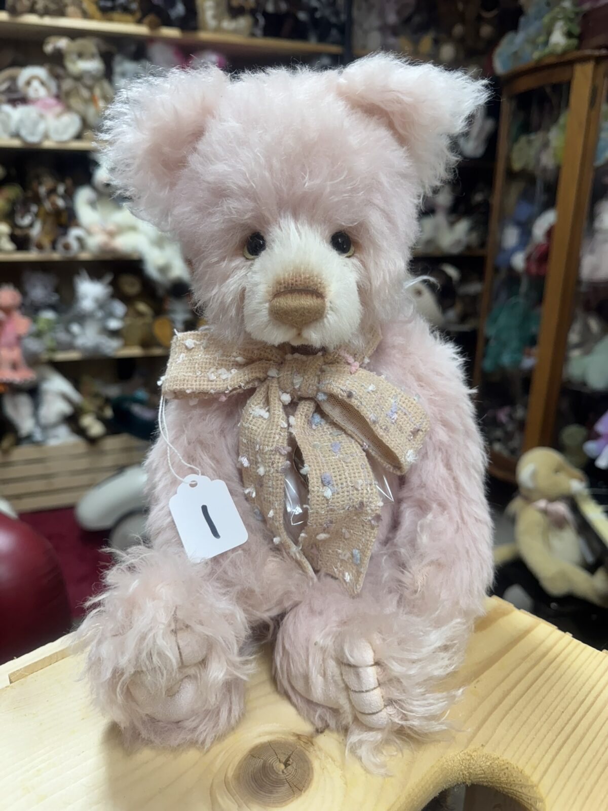 Mariah is a fully jointed bear. She is part of the leaving their paw-prints on the world collection. She is part of four of our sensational singers. Look for Aretha, Celine and Dolly. She is made of Alpaca and Mohair she has soft pale pink fur with a beige burlap bow and a pendant around her neck with a hand stitched nose. Not suitable for under 14 years of age and surface wash with care only.