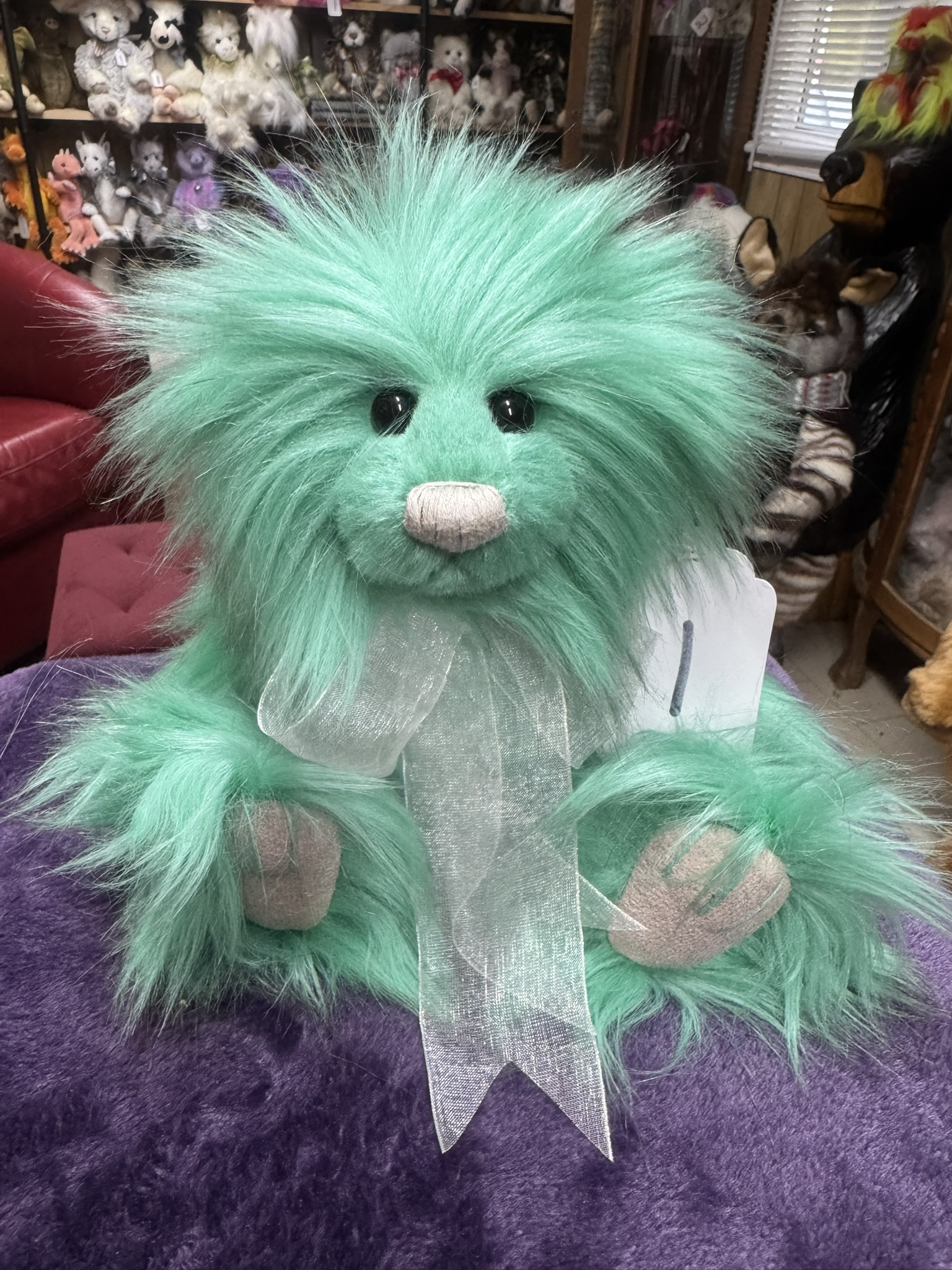 Matcha is a fully jointed bear. Look for her ice cream parlour friends Teaberry, Clotted Cream and Honeycomb. She has long soft green fur. She has a matching organza bow around her neck.
