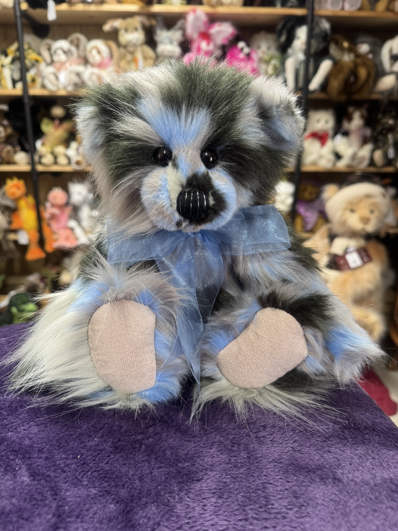 Miss Liddell is a fully jointed bear. She is one of our epic adventurers. She has a patchwork of grey, black and baby blue fur with a blue bow around her neck. Look for her fellow adventure seekers Mr Fogg, Armstrong, Mr Gulliver, Mr Baggins. Suitable for ages 3 and up.