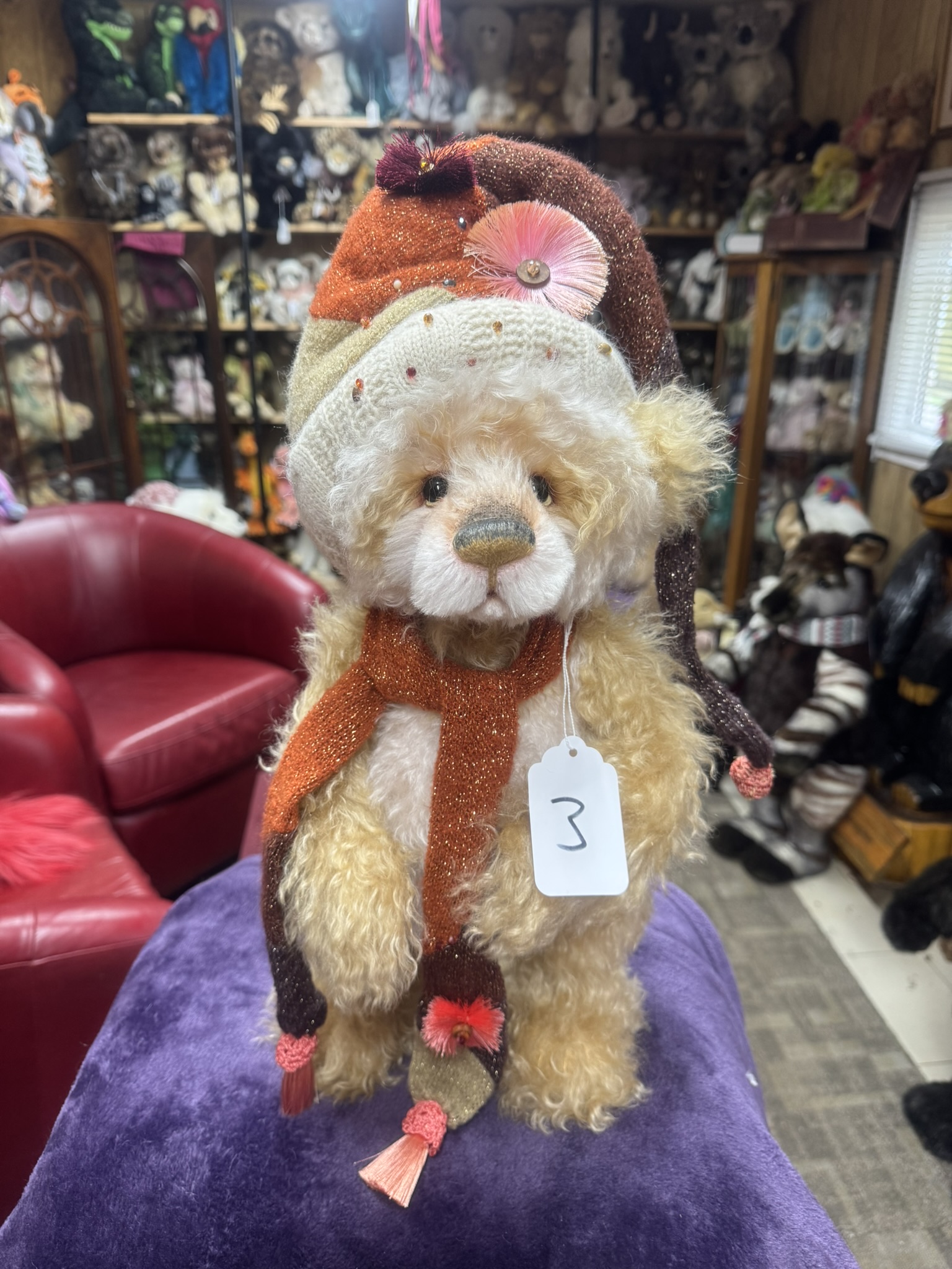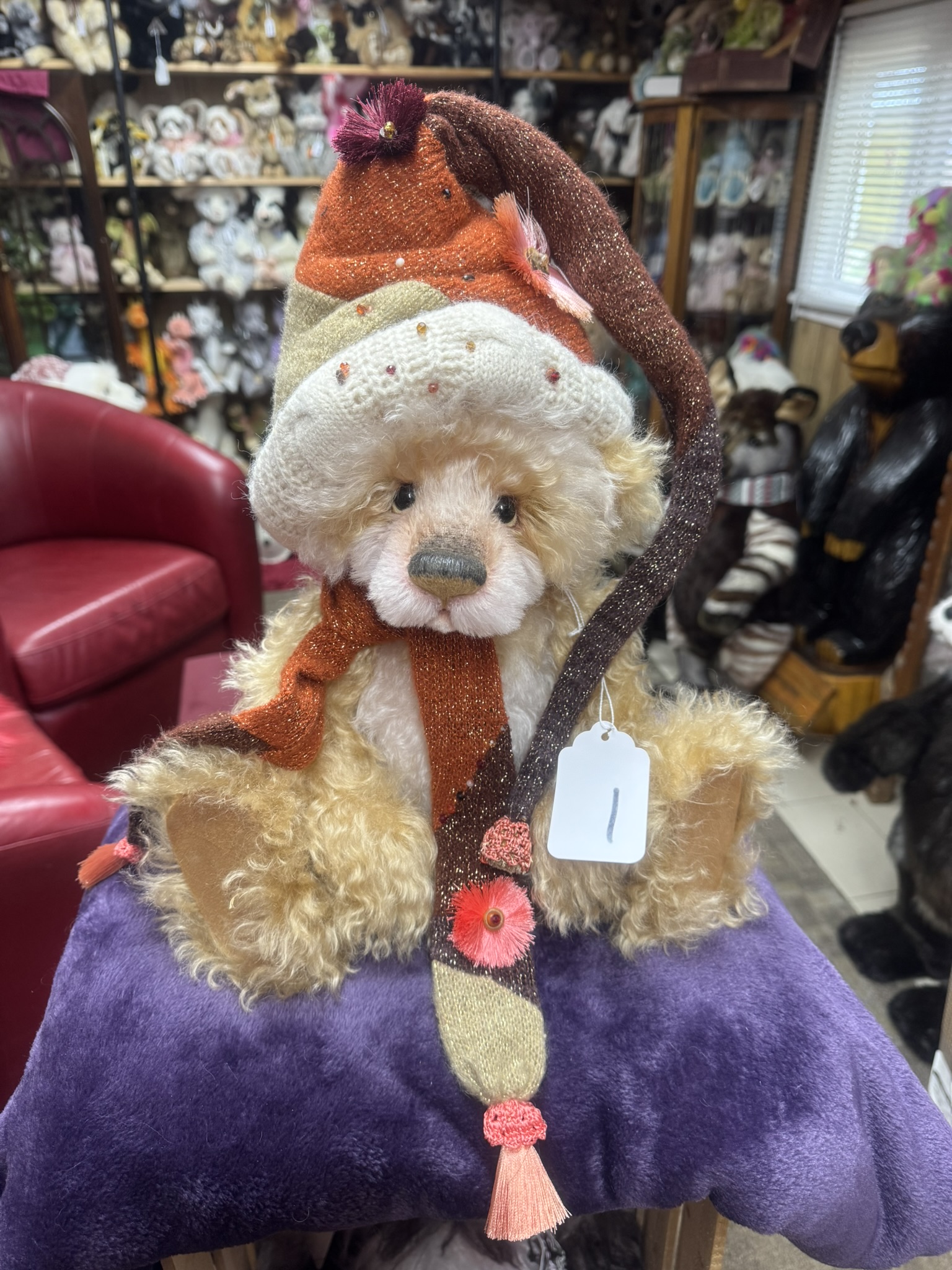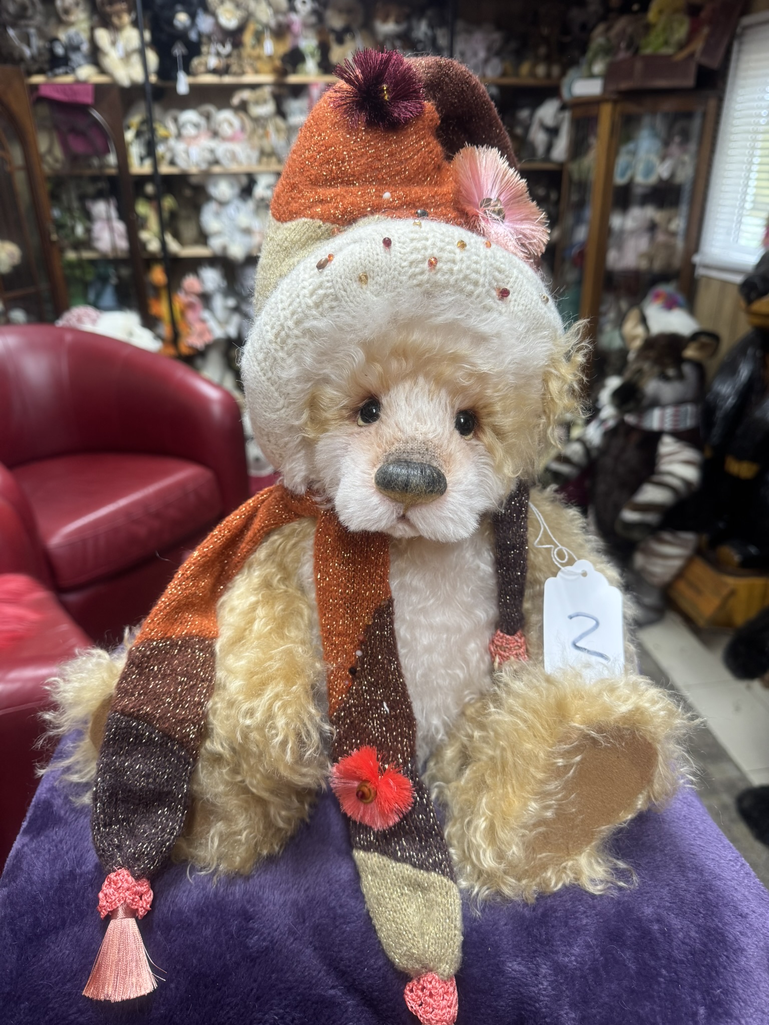 Orville is a fully jointed bear named after the Wright brothers who were American inventors. They are known for building and flying the world’s first motor-operated aeroplane. He has beige fur with a knitted long hat and matching scarf. Look up and you will find his brother Wilbur.