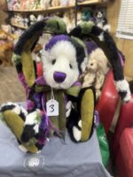 Phlox is a fully jointed plush rabbit. He is named after the flower, which comes in nearly every colour imaginable. His plush is a mix of multi-coloured hues of blacks, white, green, pink and purple all randomly made so no two are the same. He has super long posable ears, big paws and a purple hand stitched nose. He has a green and purple bow. Surface washable, suitable for 3 years +