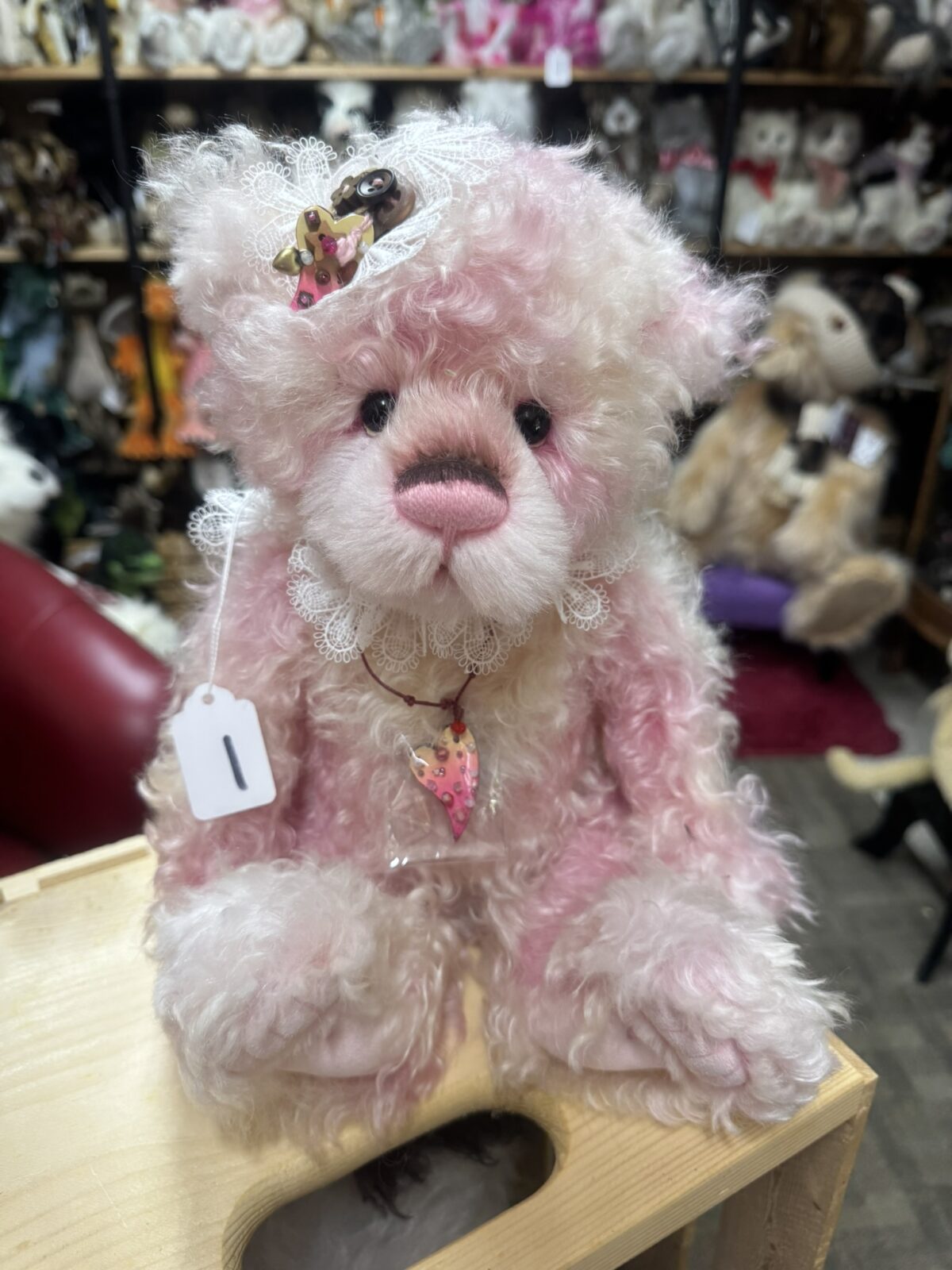 Raphaelite is a fully jointed bear. She is one of four of our architectural periods in time bears. Look for Rococo, Baroque and Renaissance. She has gorgeous fur in different shades of pinks. She has a lace collar around her neck with a heart pennant.