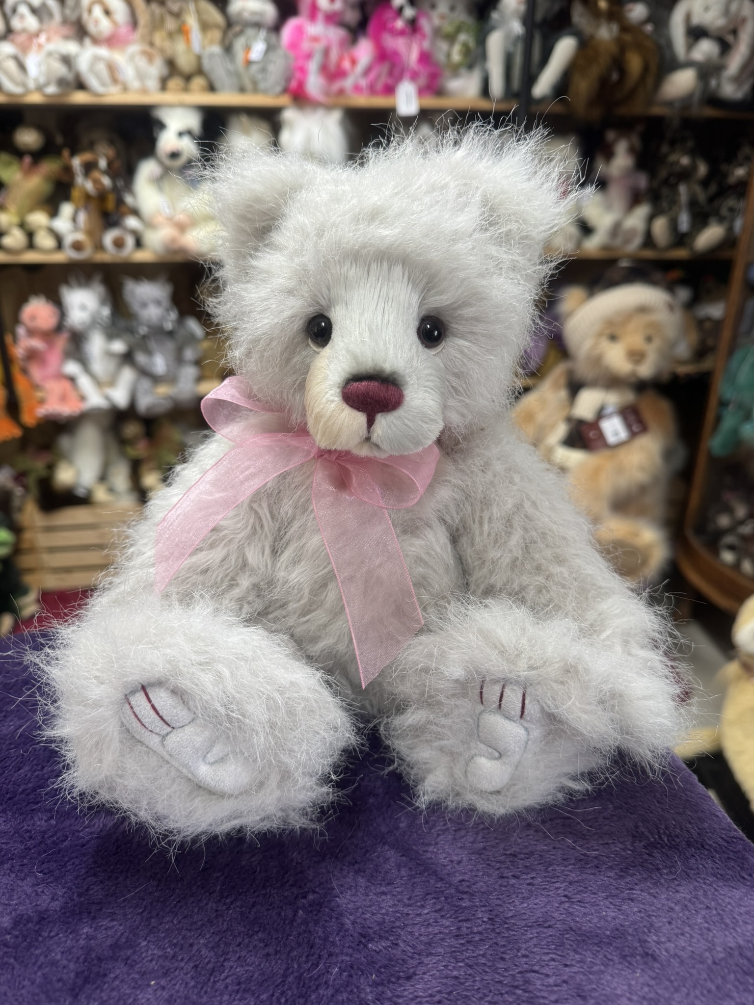 Rosienna is a fully jointed bear. She has soft light grey fur and a soft pink organza bow around her neck. She is part of a trio of bears. Look for Lilly and Natalia. Suitable for ages 3 and up.
