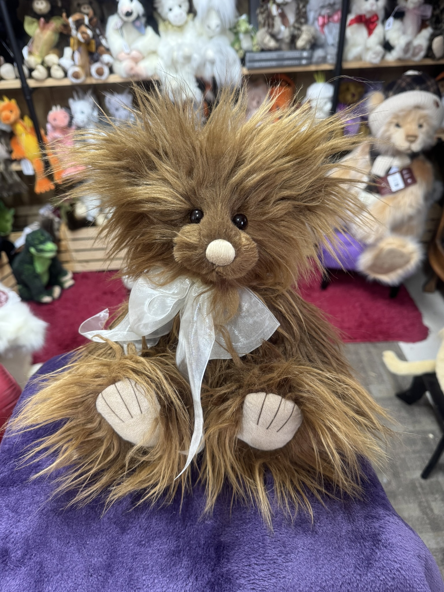 Rumbledethump is a fully jointed bear. She has long brown fur with an organza bow around her neck. She is part of a fuzzy duo. Look for Tater Tot. Suitable for ages 3 and up.