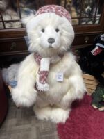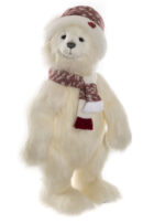 Rumpus is a fully jointed standing plush bear. He is a beautiful hatty bear with pure white plush. He has a grey hand stitched nose and matching knit scarf and hat. Look for his companions Hub Bub and Hurley Burley. Surface washable, suitable for 3 years +