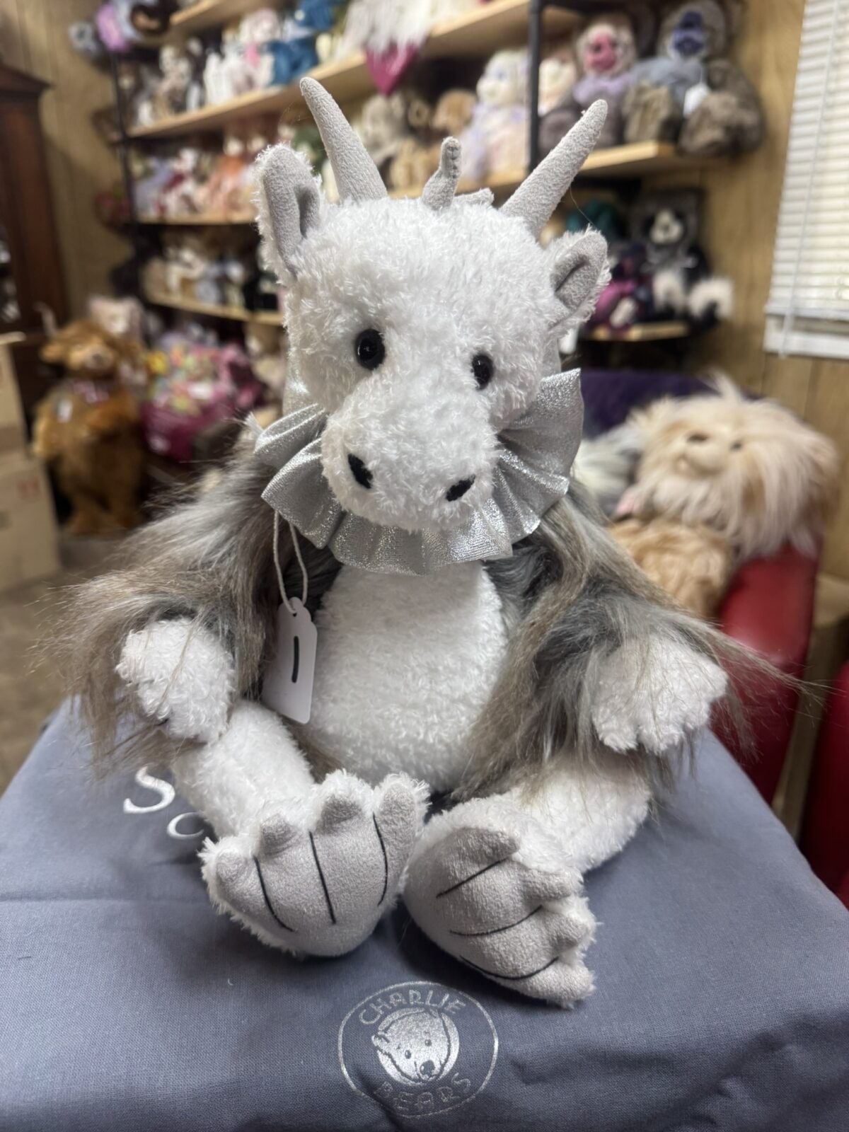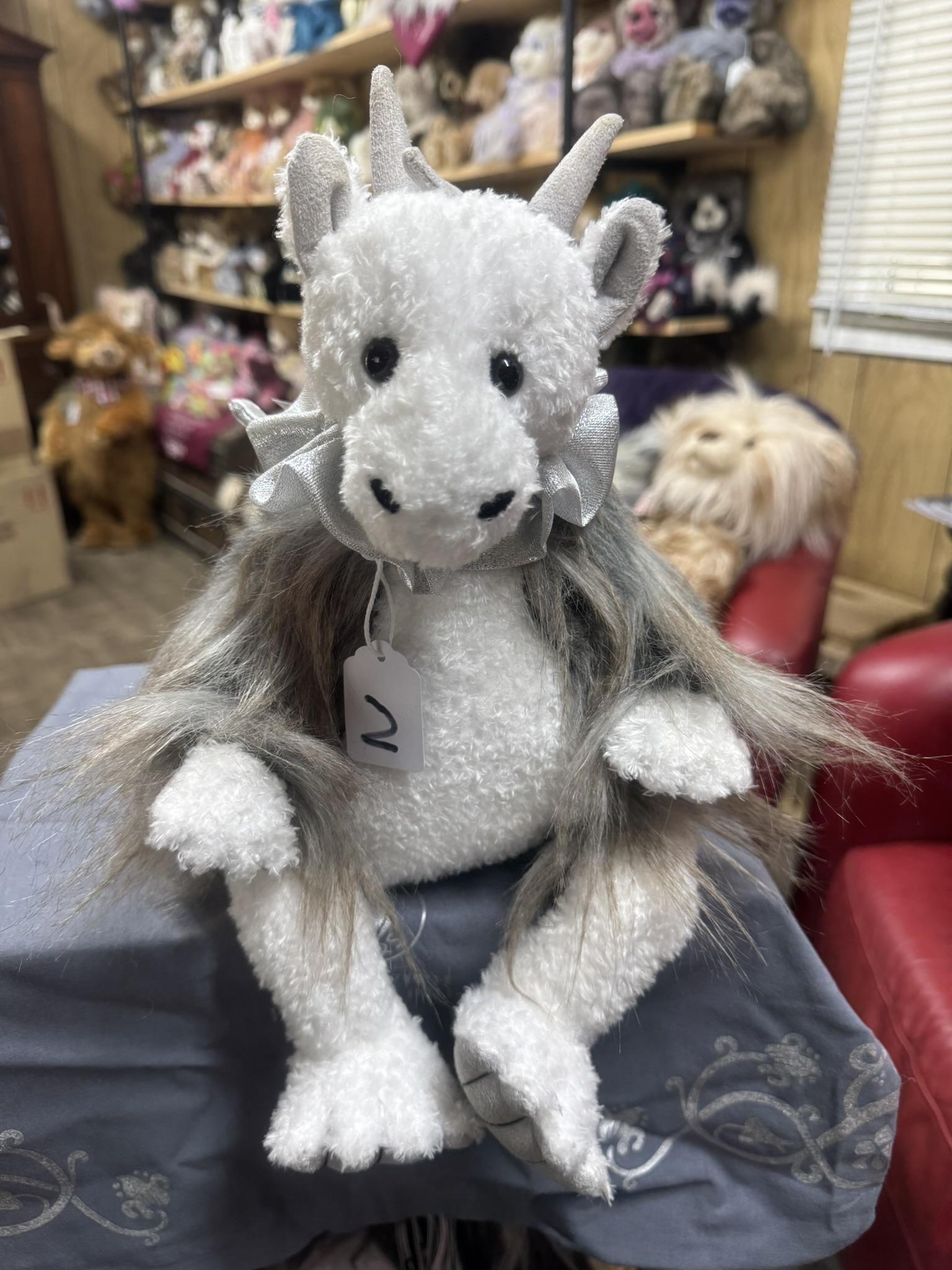 Storm Chaser is a fully jointed baby dragon. The correct term is hatchling. Look for Shadow Night as these two would make a great addition to your fierce yet adorable hug. He has long crinkle brown and grey fur on his body with a white belly, tail legs, arms and head. He has little wings and horns as they are still growing and a silver collar around his neck.