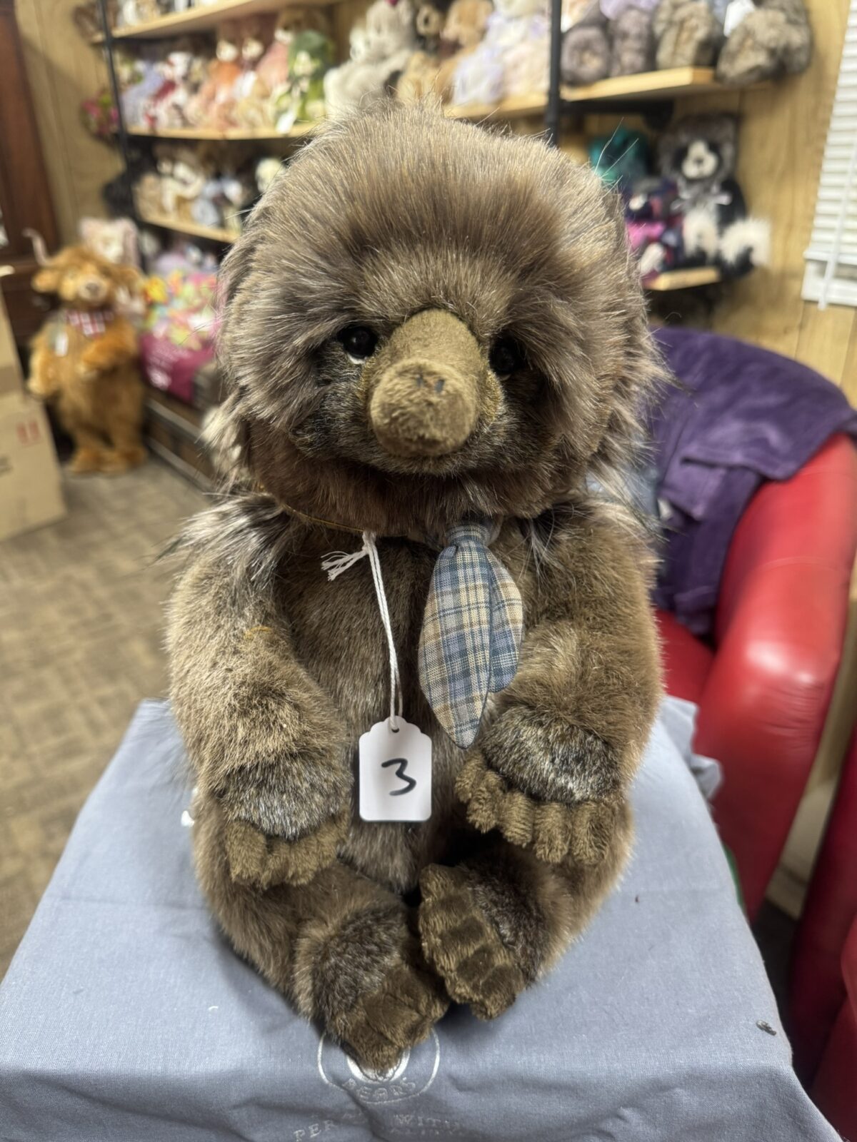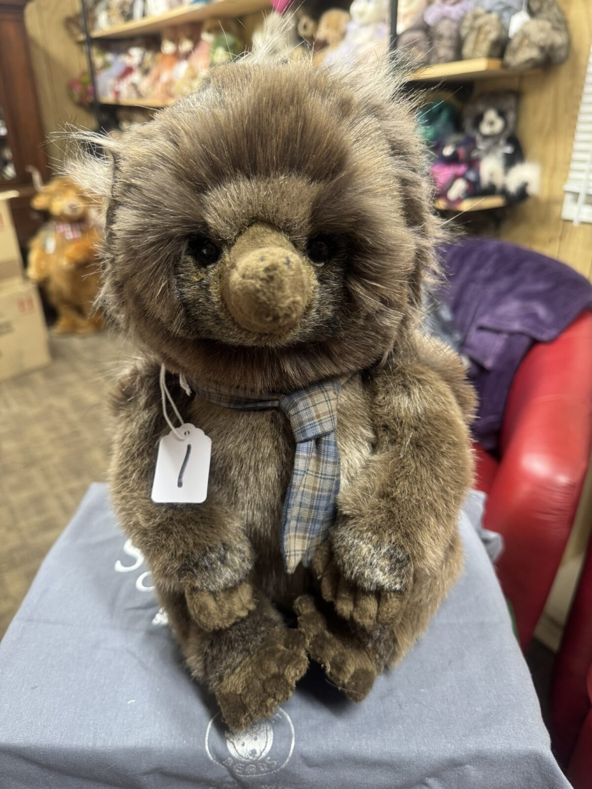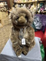 Sydney is a non-jointed Echidna plush anteater. She has dark brown shades of short pile plush all over her arms, belly, legs and face. She has long luxurious plush on her head and back in shades of browns and creams with black tips. She has a long brown nose and a plaid neckerchief around her neck. Machine washable and suitable for 18 months and up.