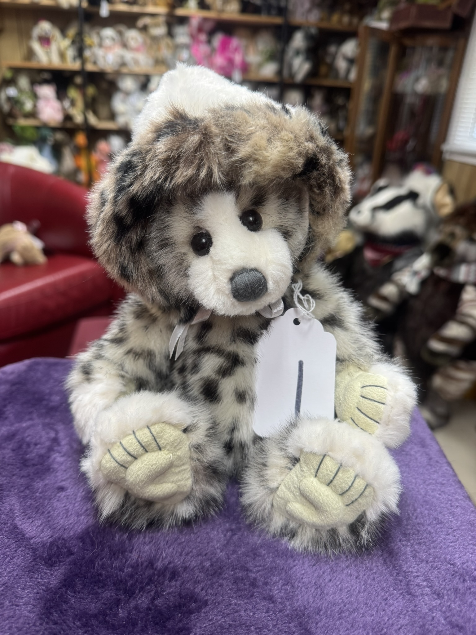 Toboggan is a fully jointed plush bear. He is part of the winter wonderland cubs mini series. He is wrapped up in a super soft and snugly winter hat. He has black a leopard print all over his white plush fur. His hat is removable. Look for his winter buddies Snowdrift and Snowslide. Suitable for 3 years and up, hand wash only.