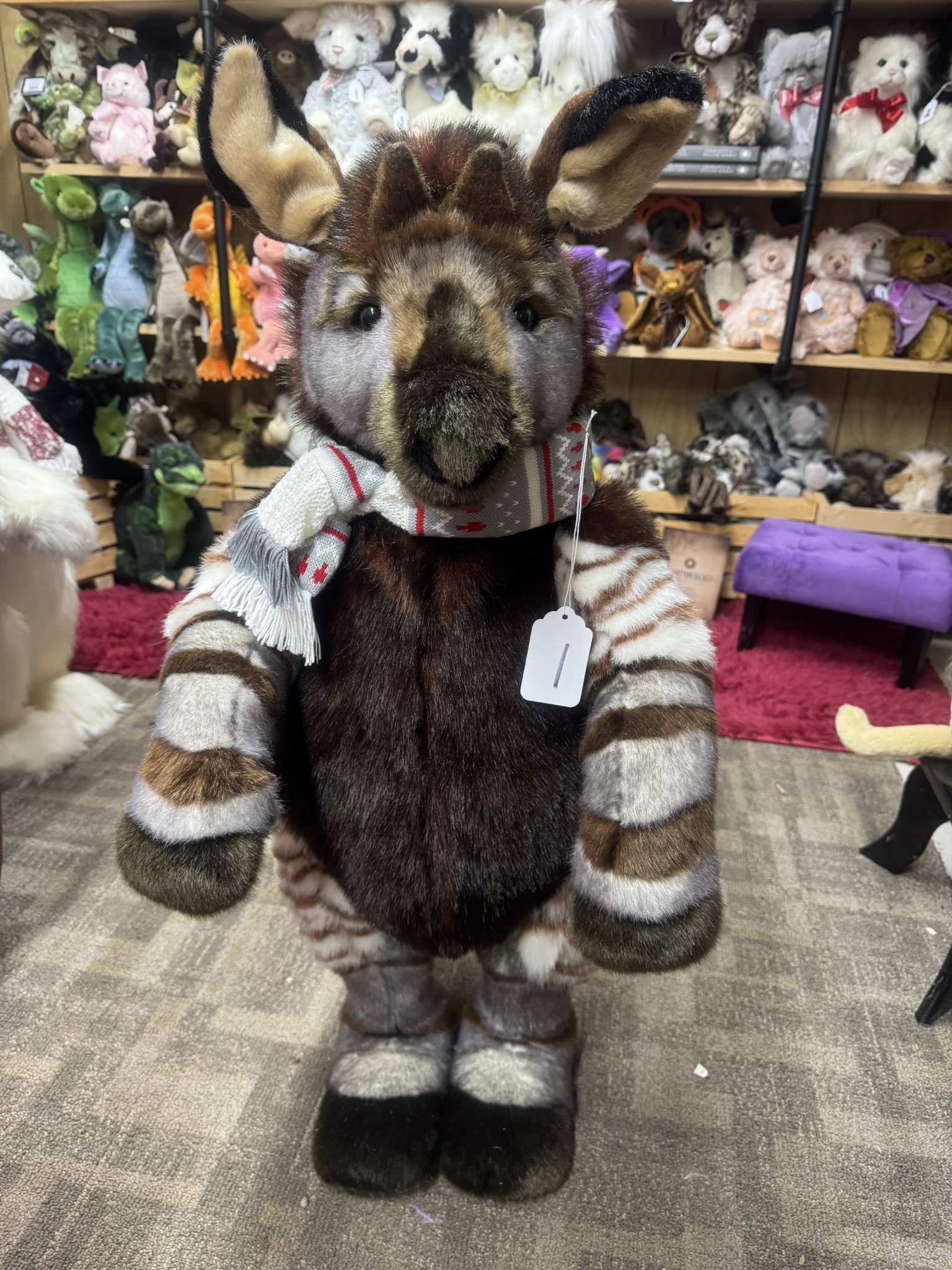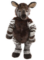 Trailblazer is a fully jointed standing plush Okapi. He has short dark brown plush with white and brown stripes on his face, arms and legs. Surface washable, suitable for 3 years +