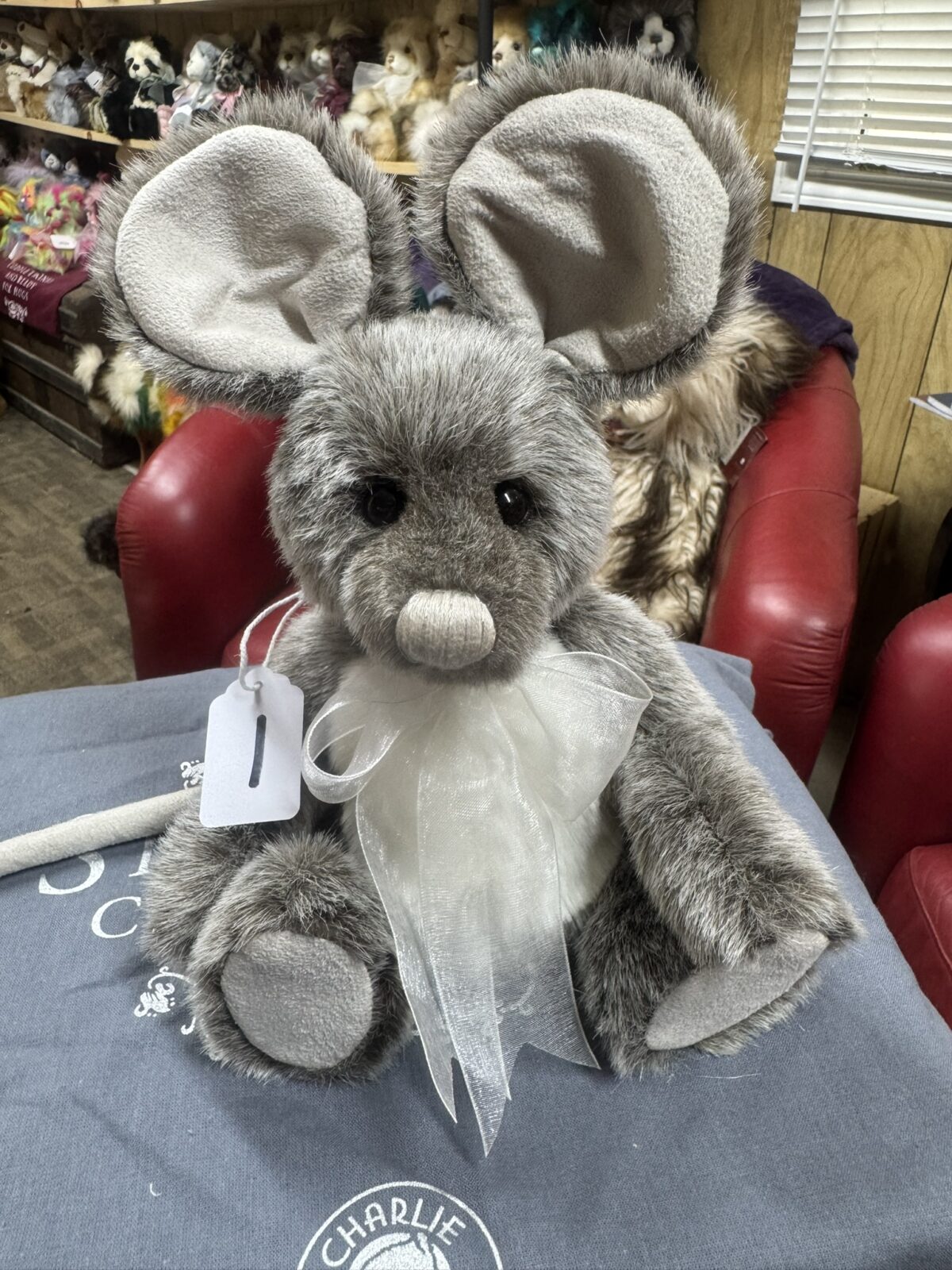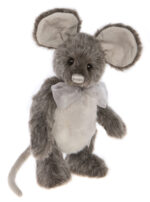 Yarg is a fully jointed standing mouse. She was named after the cheese maker Alan Gray which his last name backwards is yarg! A yarg is a special Cornish cheese that is wrapped in nettle leaves. Look for her cheesy mate Cheddar. She has large ears with a mix of short grey plush and a white belly. She has a white organza bow around her neck.